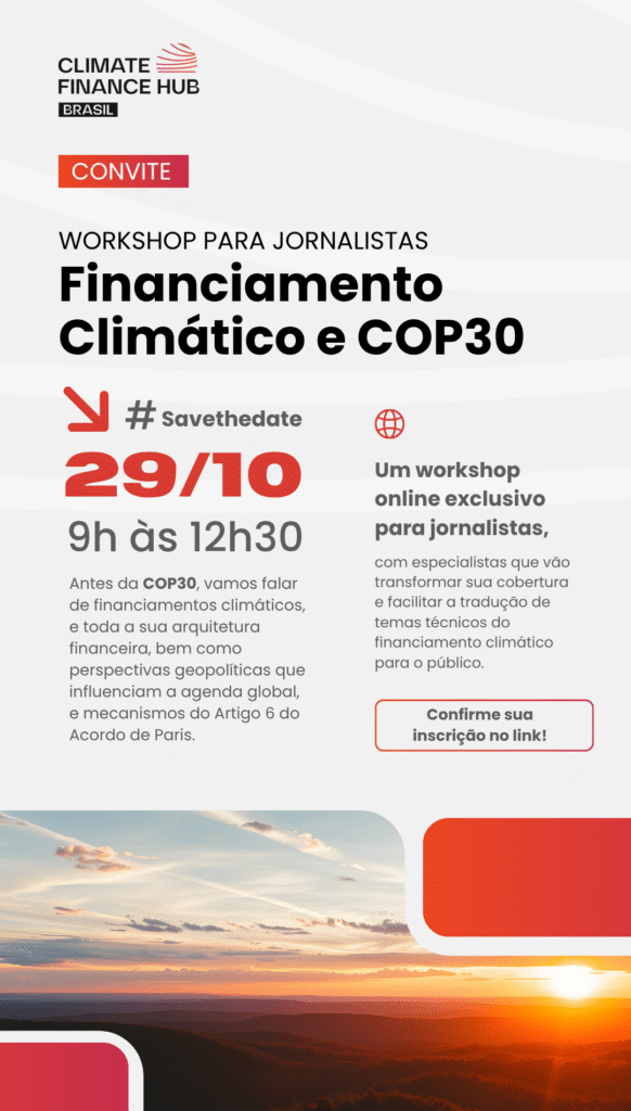 Quer entender o que está por trás dos principais debates que vão pautar a COP30 no Brasil?Vamos falar de EcoInvest, TFFF, Acordo de Paris, Justiça Climática, Taxonomia Sustentável e dos mecanismos financeiros que viabilizam o financiamento climático. Uma manhã de aula e conversa aberta — com espaço para dúvidas e trocas — para ajudar jornalistas […]
